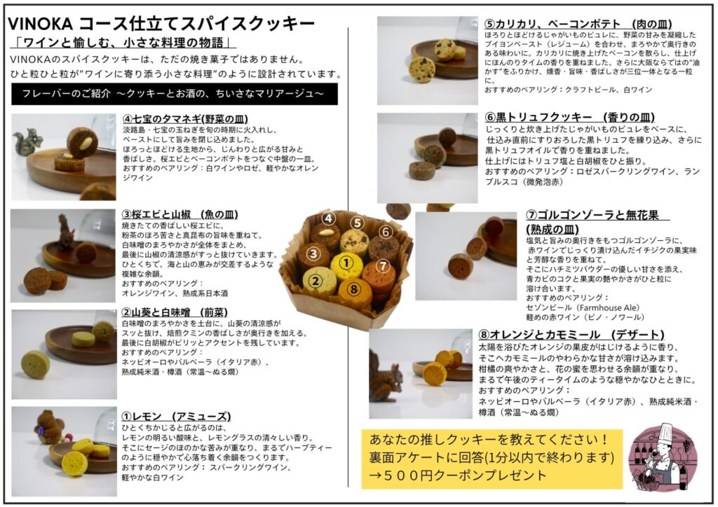 - ワインと合わせるコース仕立て8種のクッキーたち(商品説明 “後編” )「ワインと愉しむ、小さな料理の物語」 VINOKAのスパイスクッキーは、ただの焼き菓子ではありません。 ひと粒ひと粒が“ワインに寄り添う小さな料理”のように設計されています。